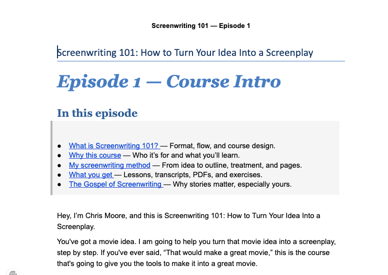 Screenwriting 101: How to Turn Your Idea Into a Screenplay is a practical, step-by-step course designed to help you take that idea and turn it into a professional-looking screenplay—one that would feel right at home on the desk of a professional reader, executive producer, literary agent, or studio head.